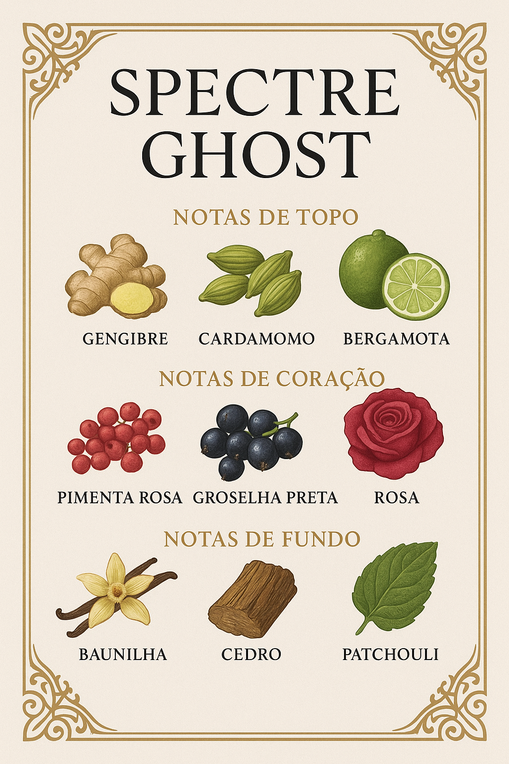 Spectre Ghost de French Avenue é um perfume Amadeirado Aromático Masculino. Esta é uma nova fragrância. Spectre Ghost foi lançada em 2023. As notas de topo são: Gengibre, Cardamomo e Bergamota. As notas de coração são: Pimenta Rosa, Groselha Preta e Rosa. As notas de fundo são: Baunilha, Cedro e Patchouli.